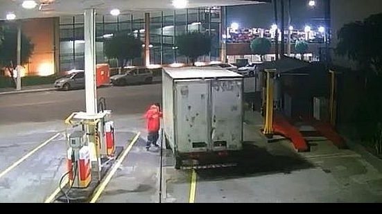Câmeras de segurança registraram o momento no qual frentista é derrubado e tenta se segurar na porta do caminhão. A discussão começou após o veículo ser abastecido, porque o caminhoneiro teria tentado sair do posto sem pagar.