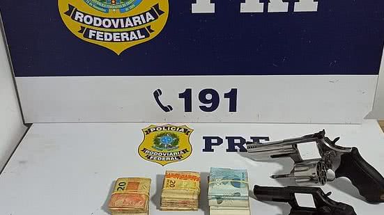 Segundo a PRF, os policiais abordaram um veículo Honda/Fit EX CVT, de cor cinza, na tarde de ontem, e ao fiscalizar o veículo, foi encontrada em posse do passageiro, a quantia de R$ 10,5 mil em espécie, dois revólveres Taurus, calibre. 38, com indícios de adulteração, e oito munições.