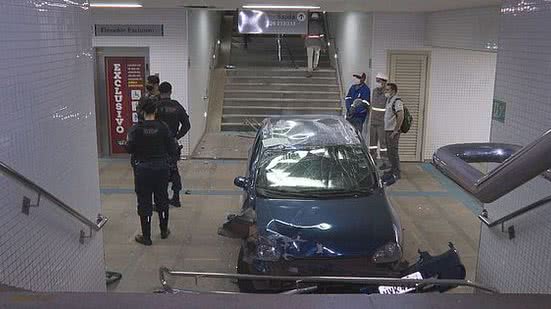 Os militares foram chamados para verificar um acidente de trânsito na região e, ao chegarem no local, perceberam que o carro estava dentro da estação do metrô, no subsolo. O veículo saiu da pista, subiu a calçada – onde fica uma parada de ônibus – e destruiu o corrimão de passageiros.