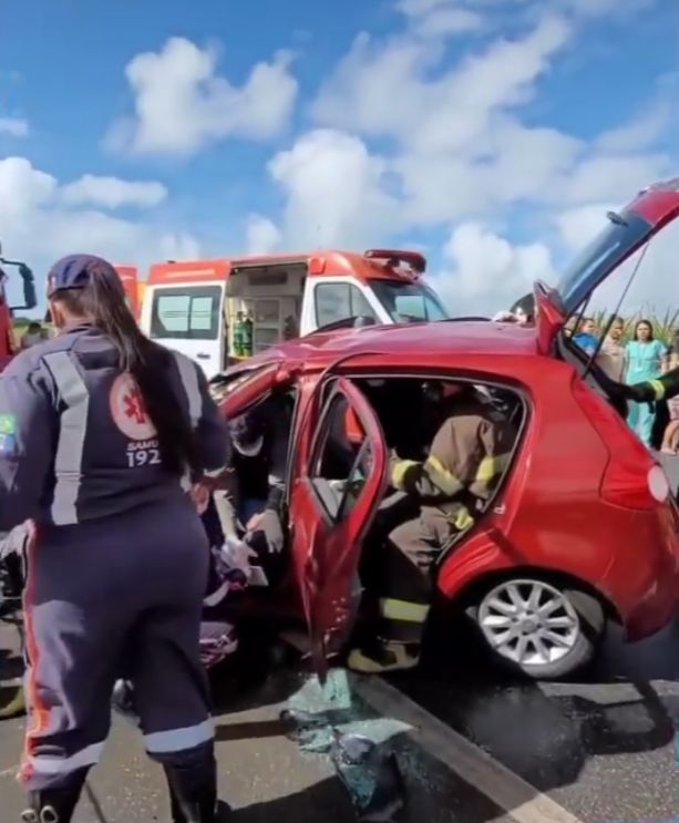 O Corpo de Bombeiros informou que recebeu o chamado para o desencarceramento da vítima por volta das 8h e enviou três viaturas com 12 militares para a região onde houve o acidente. A equipe colocou pó de serra na pista, no combustível que vazou dos dois veículos. O carro foi encontrado com a frente totalmente destruída.