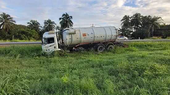 Uma carreta saiu da pista após o motorista perder o controle do veículo, na manhã desta segunda-feira, 1º de junho.