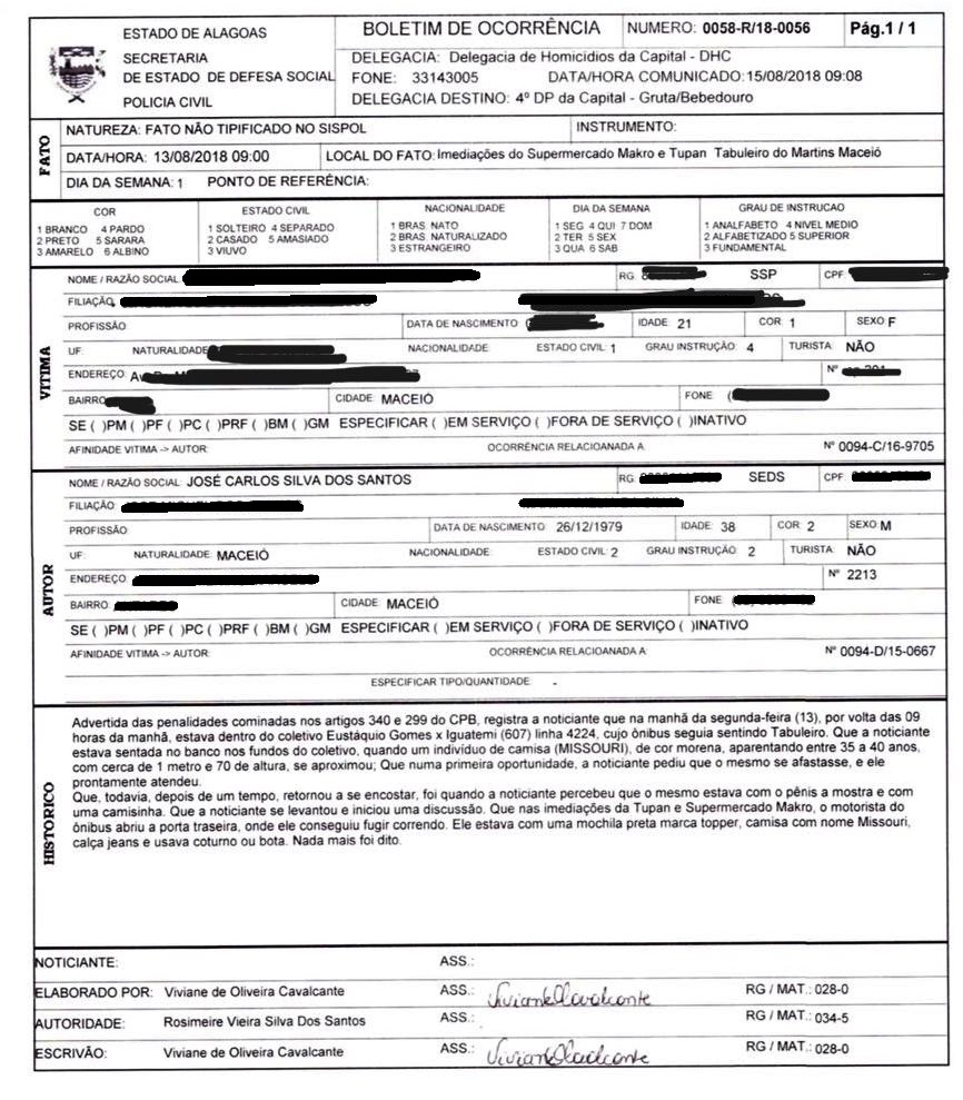 No início da noite desta quarta (15), o TNH1 teve acesso ao boletim de ocorrência registrado pela mulher assediada dentro do ônibus. Confira: