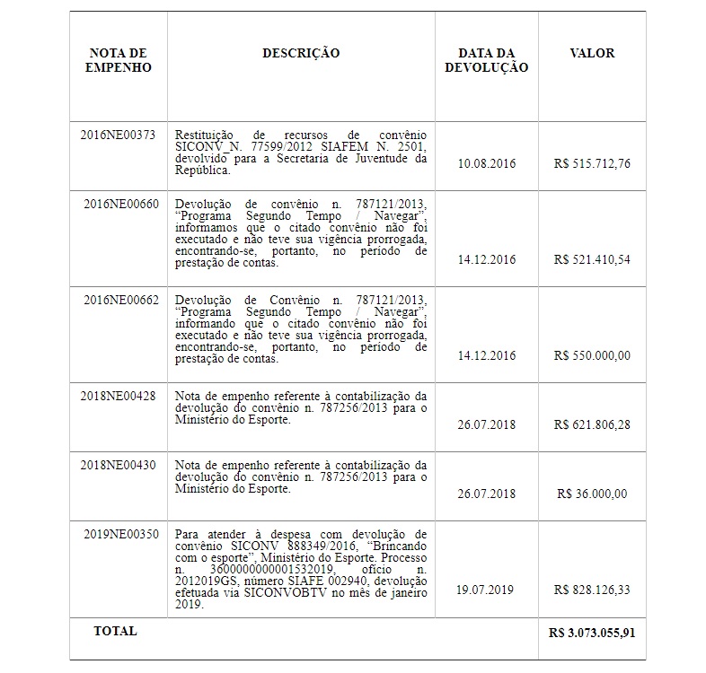 O Ministério Público de Contas informou que tomou conhecimento sobre a devolução de cerca de R$ 3 milhões aos cofres do Tesouro Nacional, provenientes de convênios firmados com o Ministério dos Esportes.