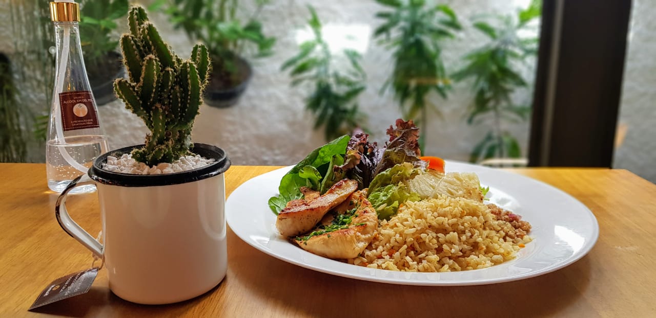 Nas mesas tem álcool gel, vazo com cacto (presença do Nordeste) e a boa comida brasileira