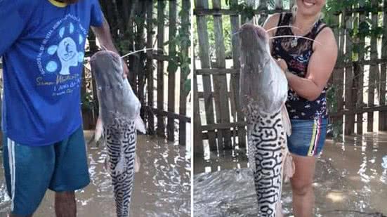 A dona de casa Gessiane Monteiro, de 32 anos, tomou um susto quando saiu de casa, na manhã dessa sexta-feira (26), e se deparou com um "bicho enorme" se mexendo na água. Quando chegou mais perto viu que se tratava de um peixe da espécie Caparari, medindo 1,10 metro e aproximadamente 12 quilos. As informações são do G1.