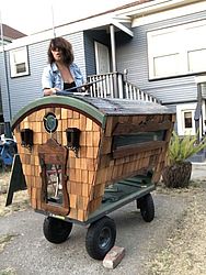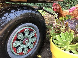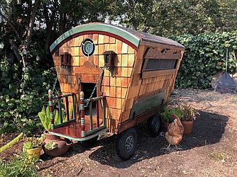 O galinheiro foi inspirado nas chamadas caravanas Romani. Segundo Dye, grande parte do material usado na construção foi doado ou reciclado. “Sempre admirei a beleza e a funcionalidade das caravanas ciganas, então decidi fazer uma em miniatura. Como meu orçamento estava apertado, desafiei-me a usar apenas itens gratuitos e recuperados para manter o custo baixo”, contou.