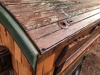 Apenas alguns detalhes e o acabamento foram comprados – sempre pela internet. “As únicas coisas que comprei foram um carrinho (usado), uma porta elétrica para o galinheiro (uma necessidade se você não quiser que as galinhas escapem e corram pra sua casa), os medalhões esculpidos para os cubos das rodas, o vitral redondo e alguns hardwares diversos”, disse Dye.