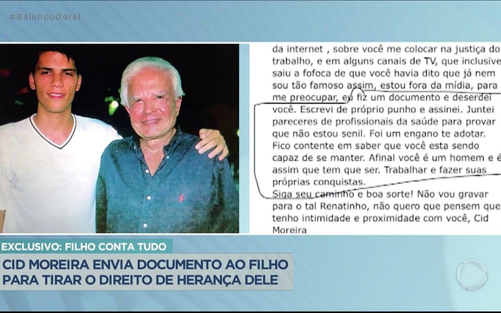 A mensagem supostamente enviada pelo antigo âncora do Jornal Nacional diz: "Eu fiz um documento e deserdei você. Escrevi de próprio punho e assinei. Juntei pareceres de profissionais da saúde para provar que não estou senil. Foi um engano te adotar. Fico feliz em saber que você está sendo capaz de se manter".