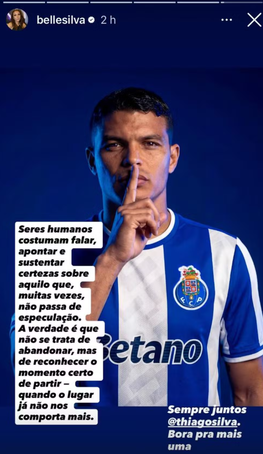 Após o anúncio de Thiago Silva como reforço do Porto, sua esposa, Belle Silva, desabafou nas redes sociais, destacando que a decisão do zagueiro não se trata de abandono, mas de reconhecer o momento certo de partir.