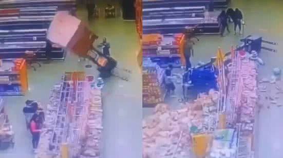 O incidente foi registrado em vídeo e viralizou nas redes sociais. Nas imagens, é possível ver um funcionário operando o equipamento, enquanto a cliente passeia pelas gôndolas e observa os produtos. Na sequência, o maquinário tomba e atinge a mulher.