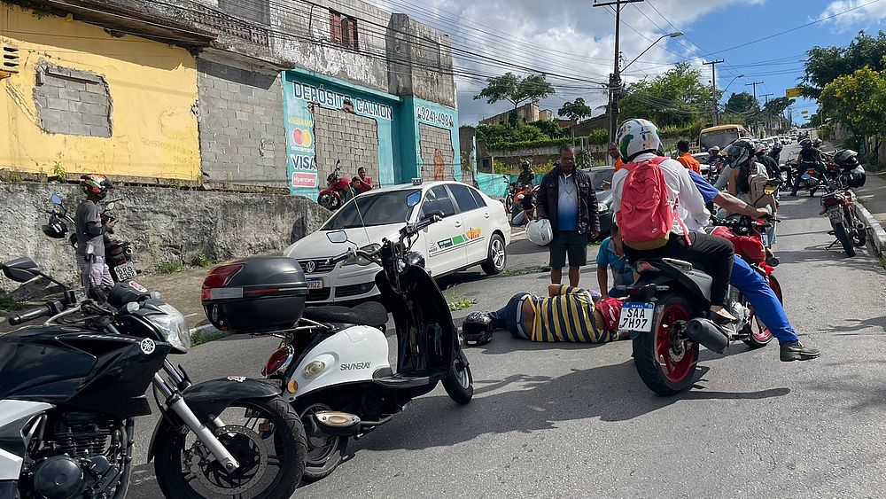 Uma mulher foi atropelada por uma motociclista na Ladeira do Calmon, no bairro Bebedouro, na manhã desta terça-feira (24). A vítima, que tentava atravessar a via, sofreu escoriações leves, enquanto o condutor caiu da moto e também ficou ferido. O acidente aconteceu em horário de pico e o trânsito ficou lento na região.