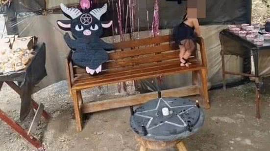 As imagens da festa mostram a criança vestida de preto ao lado de uma piñata parecida com Baphomet, uma divindade com cabeça de bode usada em rituais satânicos.