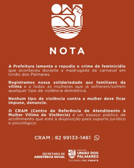 A Prefeitura de União dos Palmares repudiou o feminicídio e colocou o Centro de Referência de Atendimento à Mulher Vítima de Violência (CRAM) à disposição para a família da vítima. Veja abaixo: