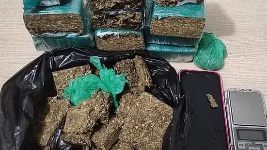 Após uma busca domiciliar, foram encontrados no interior da residência uma balança de precisão, um aparelho celular e o entorpecente.