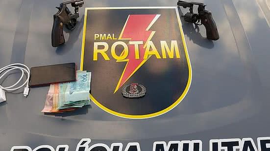 A suspeita, de iniciais M. L. N., de 55 anos, foi flagrada com dois revólveres, de calibre 38, e a quantia de R$ 580 dentro de sacola plástica. O celular dela e o carregador também foram recolhidos.