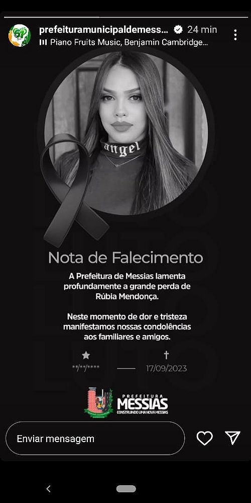 Prefeitura de Messias lamenta morte de jovem - Por meio de uma postagem no story do Instagram, a Prefeitura de Messias lamentou a morte de Rubia Mendonça. O Município prestou solidariedade aos familiares e amigos da vítima. Confira abaixo: