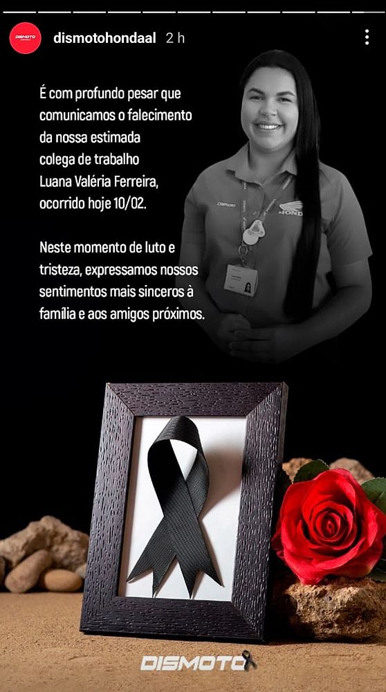 Vítima trabalhava em concessionária de motos - Luana, vítima de choque elétrico, era consultora de uma concessionária de motos na cidade de Arapiraca. A empresa usou as redes sociais para lamentar a morte da funcionária e prestar solidariedade à família e amigos. Veja a postagem no Instagram abaixo: