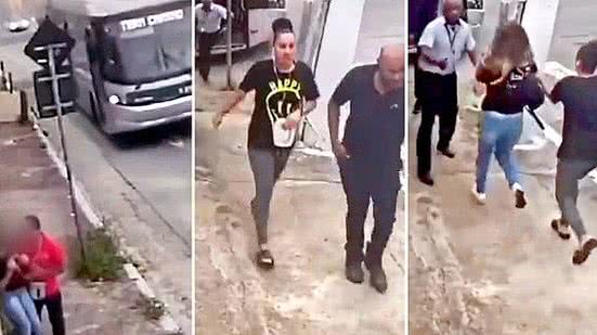 Os dois então caminham pela calçada como se fossem um casal e viram a esquina. Nesse momento o ônibus para, e uma passageira desce e vai em direção à vítima. Na sequência o motorista e outros dois passageiros também descem.