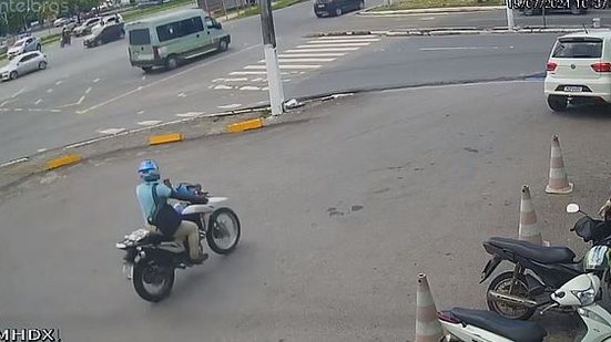 As imagens de câmeras de segurança da loja não chegam a registrar a ação, mas mostram o motociclista parando ao lado do carro e, depois de um tempo, fugindo com a bolsa de couro, que continha um notebook, três aparelhos celulares, um perfume e R$ 102 em espécie.