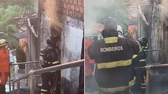 A ocorrência foi registrada às 15h38 no sistema da corporação, que enviou também cinco viaturas ao local. A casa fica na Travessa Artemísia, ao lado de uma escadaria. A reportagem recebeu imagens que mostram os bombeiros combatendo o incêndio com uso da mangueira na entrada da residência.