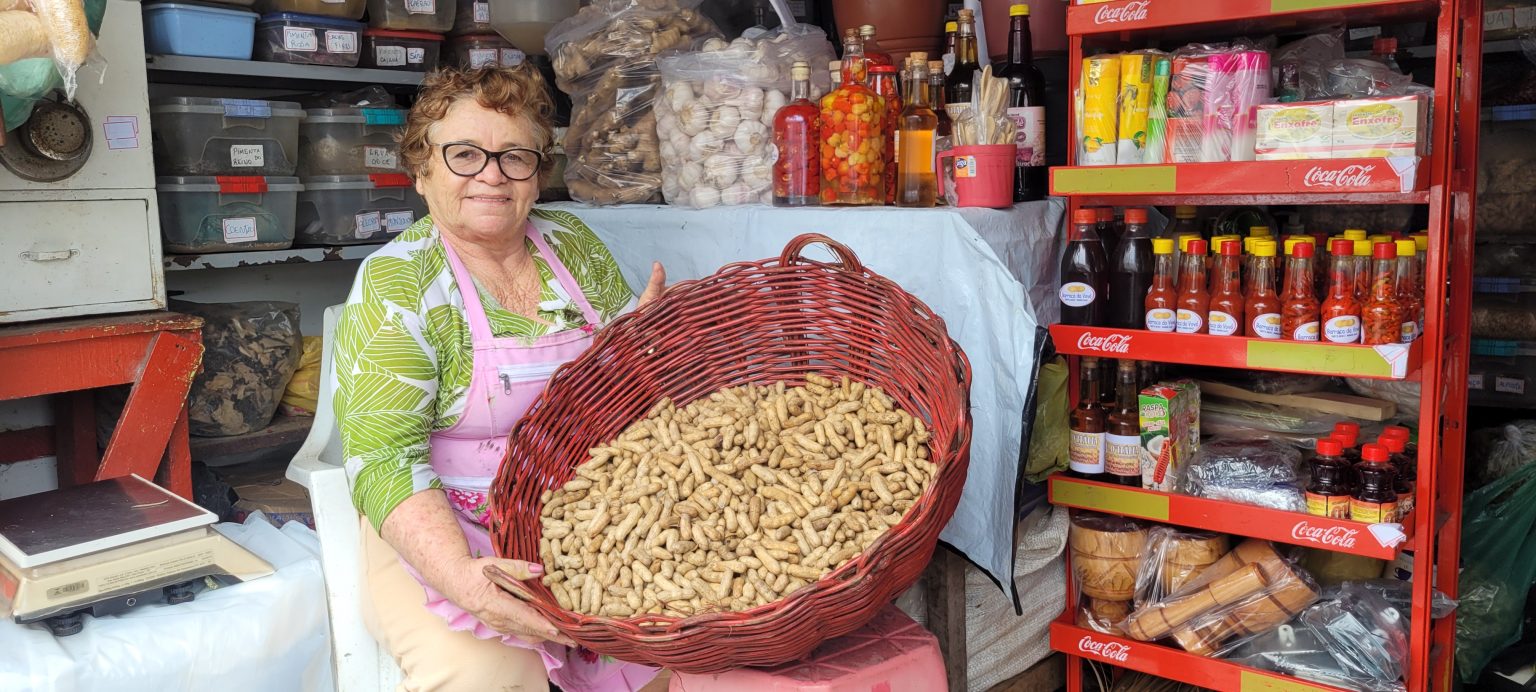 “Eu nasci no mercado”, conta alagoana Maria de Fátima, conhecida como Galega, no auge dos 67 anos, 45 deles dedicados ao mercado público, como a Feirinha da Jatiúca, onde mantém sua barraca. Lá é fácil de achar, fica na esquina, e chama a atenção pelo colorido das plantas, pimentas, flores e ervas que se misturam ao aroma dos temperos. Mas é o amendoim cozido, daqueles para comer a perder de vista, a estrela da casa.