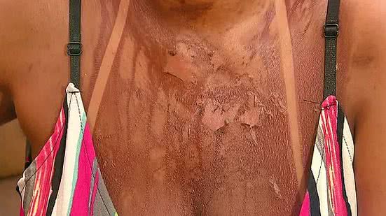 "Expliquei a ela, ela disse que eu peguei uma insolação, que estava 39 graus e me passou sulfato de prata, nistatina e pós-sol, misturados, para passar no corpo. Eu passei, começou a arder e queimar mais que o normal também. Na terça-feira (17), comecei a ver as bolhas e corri para a emergência", declarou.