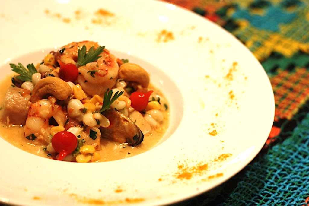 Mungunzá de milho branco ou amarelo? Tanto faz. Cozido no leite de coco e açúcar, a iguaria é mais do que um prato típico das festas juninas entre os nordestinos, um bom mungunzá cai bem a qualquer hora do dia e em qualquer época do ano. Esse clássico ganhou uma nova roupagem pelas mãos de nosso chef Guga Rocha (@chefgugarocha), que levou o milho e o coco para uma incursão marítima. Os ingredientes estão numa receita do mar, que leva camarão, peixe, lula, mexilhões e polvo ao leite de coco. Em vez de açúcar, o sal. Batizado de Mungunzá do Mar.