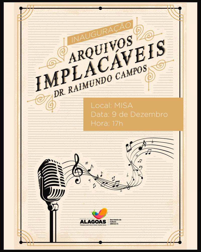 O Governo de Alagoas, por meio da Secretaria de Estado da Cultura (Secult), inaugura no próximo dia 9 de dezembro, às 19h, o Memorial Raimundo Campos, no Museu da Imagem e do Som de Alagoas (Misa). Intitulado “Arquivos Implacáveis”, o acervo do médico e pesquisador Raimundo Alves Campos foi doado ao Museu 12 anos após seu falecimento, e traz conteúdos raros e inéditos de suas produções enquanto amante da arte, literatura, música e radiofonia.
