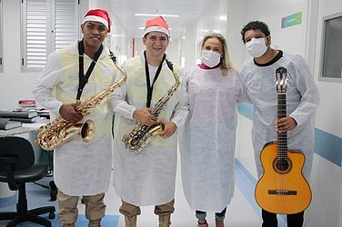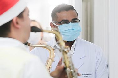 A música tomou conta dos corredores do hospital e acalentou os corações dos pacientes cheios de saudade de seus familiares. O som do saxofone e do violão também levou alegria aos profissionais de saúde que estão na linha de frente do combate à pandemia do novo coronavírus.