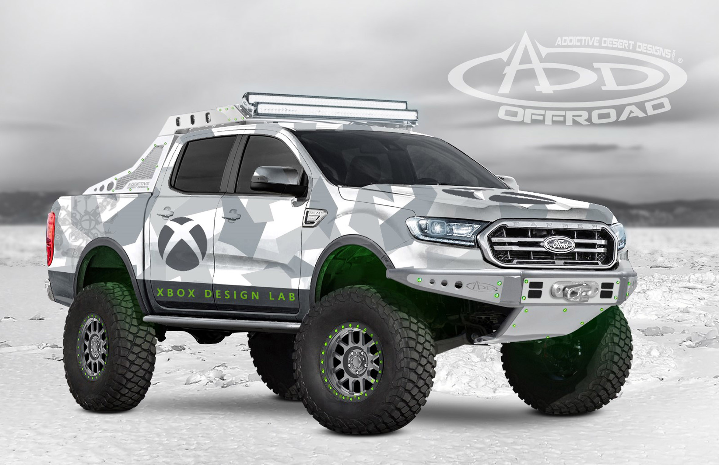 A Ranger Xbox, com visual camuflado de inverno e suspensão elevada, pode ser o carro mais próximo saído dos videogames. Preparada pela Addictive Desert Designs, a picape traz um console Xbox One que permite jogar nos bancos traseiros ou usando as telas de 42 polegadas na caçamba.