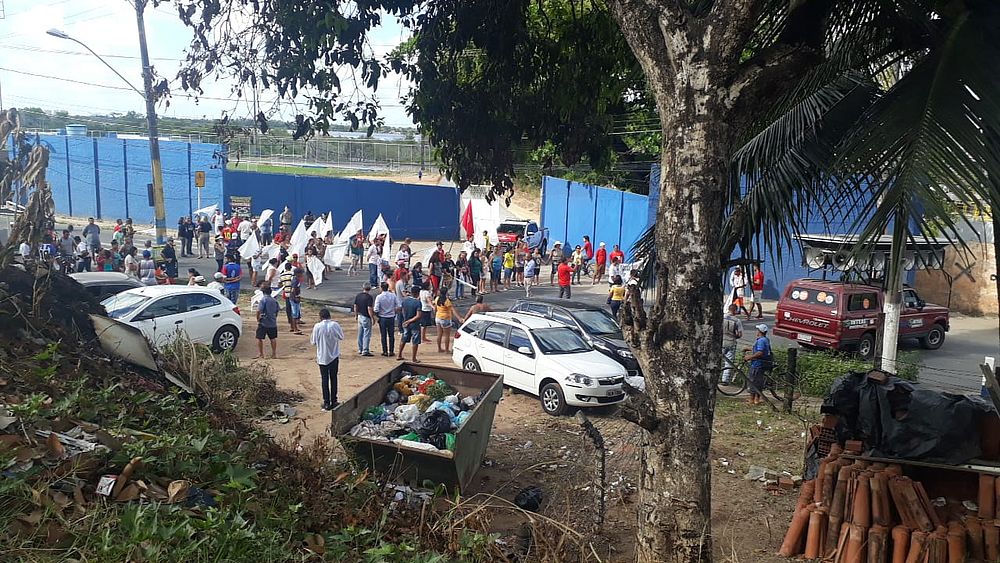 Moradores do Mutange e região realizaram um protesto, na manhã desta quinta-feira, 28, em frente à sede da Braskem, mineradora apontada como responsável pelo fenômeno de subsidência que afeta o bairro, e outros locais como Pinheiro, Bebedouro e Bom Parto.