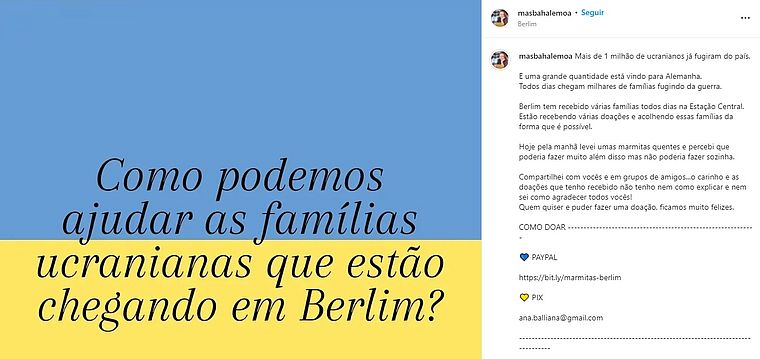 Doações - Sobre o ato de solidariedade com os refugiados, Daia disse que a ficha caiu na última sexta-feira, 4, quando os voluntários levaram as marmitas no final da noite. Com a maior procura de pessoas interessadas em ajudar de alguma forma, ela teve a ideia de colocar o perfil no Instagram à disposição para que as arrecadações possam ser feitas mesmo por quem está longe da Alemanha. Há a possibilidade de brasileiros ajudarem com transferência via Pix e também através do PayPal. Veja as instruções no post abaixo: