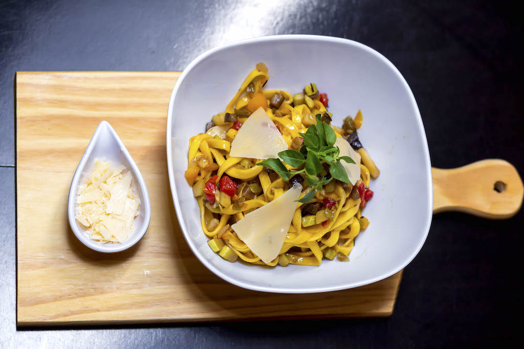 Os vegetarianos têm a opção do talharim à la méditerranée com ratatouille (ensopado de beringela, abobrinha, pimentão, alho e ervas de Provence). Leve e saboroso.