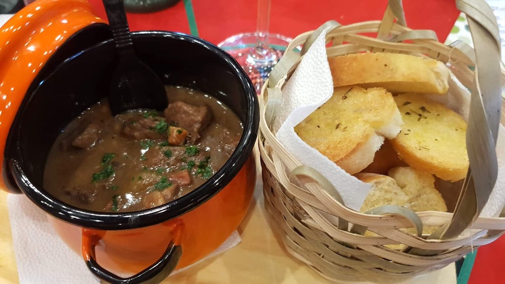 Outro prato típico francês é bourguignon, uma tradição de carne bovina marinada em vinho tinto, com alguns vegetais e condimentos. O prato vem de uma região chamada Borgonha, local dos vinhos célebres de todo mundo. Para acompanhar, torradas.