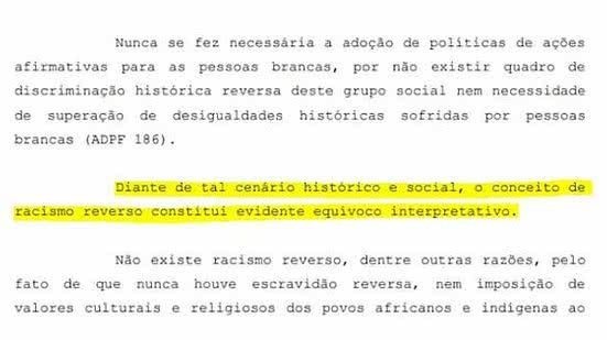 Ele argumenta que o conceito de racismo reverso é ‘equívoco interpretativo’ indicando que não há sentido entender que a lei teria a finalidade de proteger os grupos majoritariamente brancos contra discriminação.