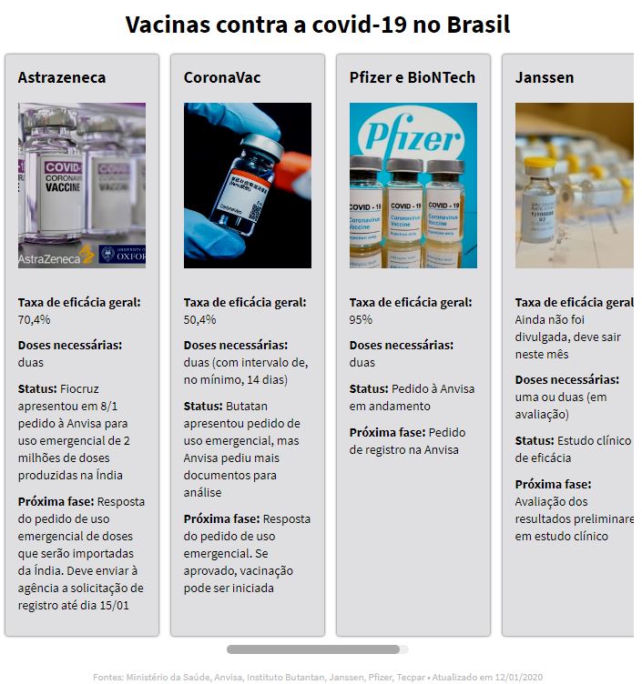 "A vacina do Butantan atende plenamente [aos requisitos da Anvisa]. E atendendo plenamente, ela deve ser colocada imediatamente após a aprovação da Anvisa para a vacinação dos brasileiros", afirmou Doria, que teve uma vitória política com a incorporação da CoronaVac no PNI (Plano Nacional de Imunização), do Ministério da Saúde.
