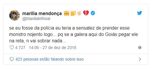 A cantora Marília Mendonça, usando o Twitter, escreveu que caso fosse policial prenderia o acusado. “Se a galera daqui do Goiás ‘pegar ele na reta’ não vai sobrar nada”, publicou a sertaneja. Marcelo D2 também demonstrou indignação na rede social.