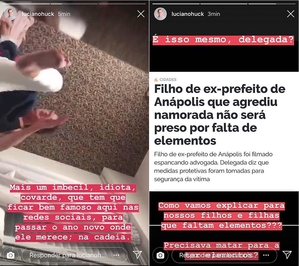 O apresentador da Rede Globo, inclusive, compartilhou uma matéria publicada pelo Mais Goiás na última quarta cujo título é: Filho de ex-prefeito de Anápolis que agrediu namorada não será preso por falta de elementos. “É isso mesmo, delegada?”, escreveu Huck no Stories do Instagram. “Como vamos explicar para nossos filhos e filhas que faltam elementos? Precisava matar para ter elementos?”, indagou.