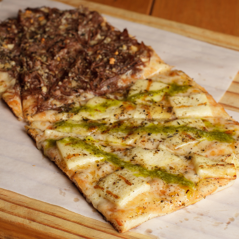 Pizza do Noel: Pizza especial com metade de lombo defumado com parmesão e cebola, outra de frango com queijo do reino.