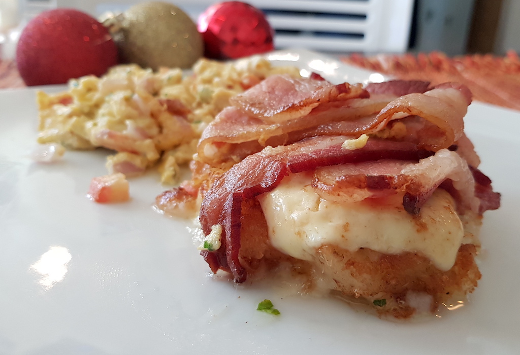 Macaxeira egg bacon: creme de macaxeira grelhado, acompanhado de ovos mexidos e bacon.