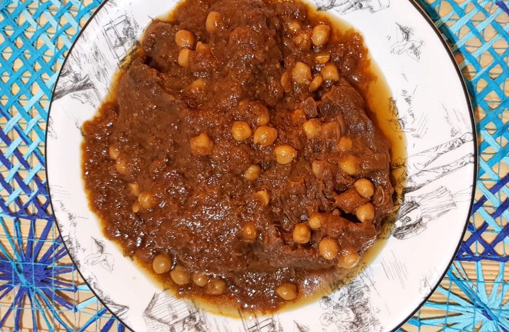 Bifes no molho cerveja com grão de bico de sabor bem aguçado, para comer com arroz ou macarrão ao alho e óleo.