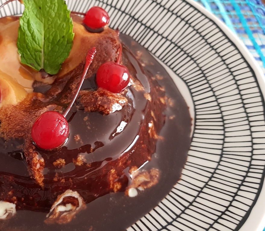 Detalhe da torta gelada de creme de baunilha com calda de caramelo e chocolate e flor de sal