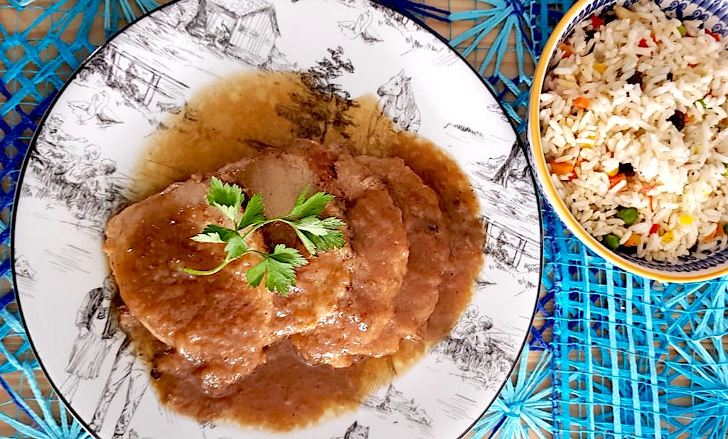 O Pernil suíno já é uma carne saborosa. Quando é marinado por 24 horas no vinho branco, laranja, sohyo, alecrim e vai ao forno, o resultado é bom demais, um agridoce arretado ao paladar, e vem molhadinho na própria carne. Para escoltar a gostosura, o arroz à grega. Nunca pensei que até arroz congelado seria bom, e é!