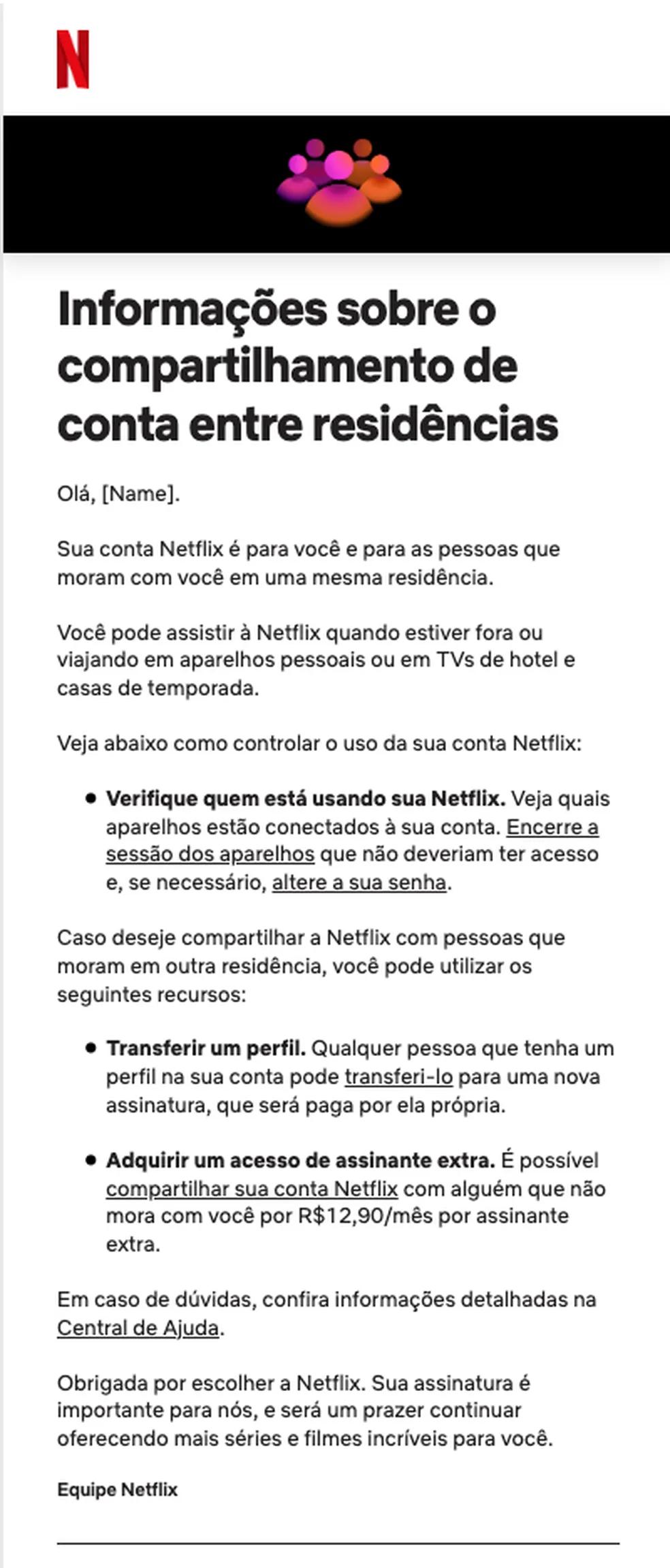 "A partir de hoje, começaremos a enviar este email [veja ao final da reportagem]para assinantes que compartilham a conta Netflix fora da própria residência no Brasil", disse a empresa em comunicado.