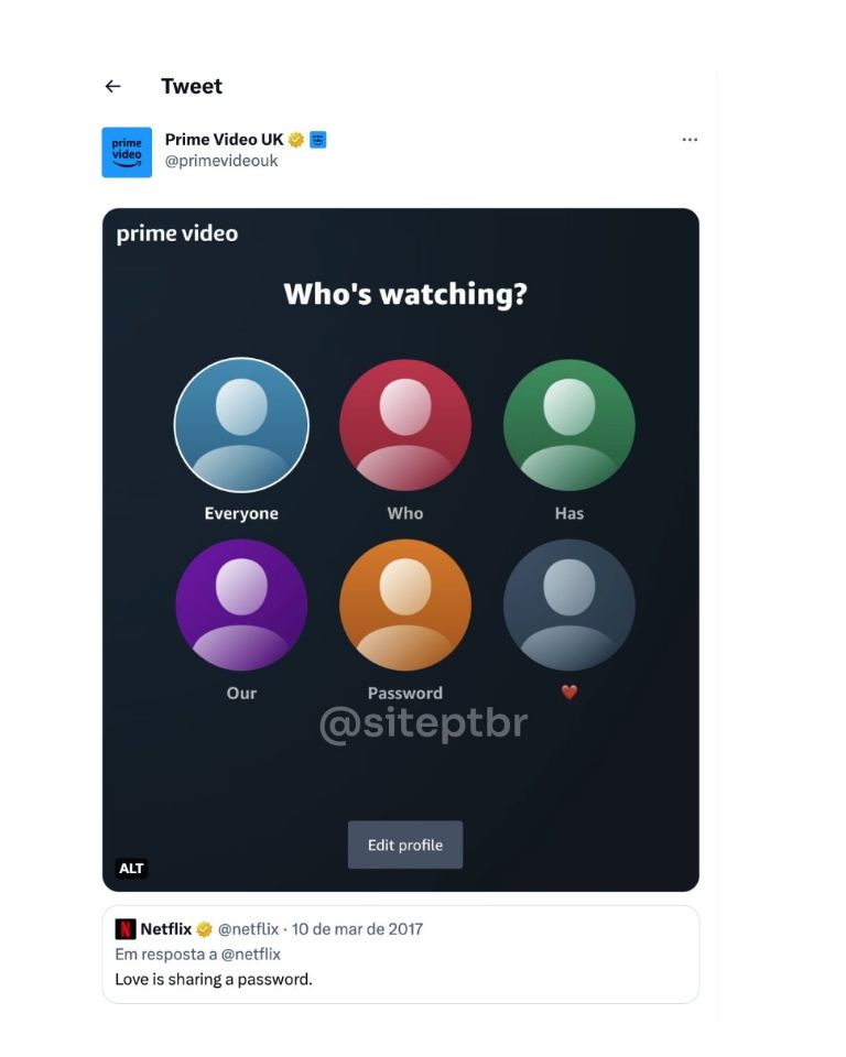 O Amazon Prime Video, plataforma de streaming concorrente da Netflix, resgatou um tweet antigo sobre “compartilhamento de senha” da empresa, em que diz: “Amor é compartilhar a senha", adicionando uma captura da tela inicial do Prime Video, que não possui políticas que restringem o compartilhamento de senhas. A publicação viralizou.