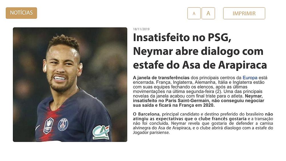 De acordo com a notícia, o menino Ney teria perdido a janela europeia de contratação, e sido obrigado a renovar com o time francês para 2020. Até aí, uma possível verdade, mas o texto começa a fugir um tanto da realidade quando diz que o atleta teria revelado que “gostaria de defender a camisa alvinegra do ASA de Arapiraca” e que o clube abriria diálogo com a equipe do jogador parisiense. Será que os alvinegros gostariam da novidade?
