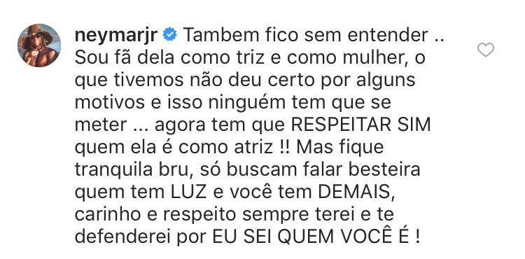 O jogador concordou com a frase e elogiou a atriz. "Também fico sem entender. Sou fã dela como atriz e como mulher, o que tivemos não deu certo por alguns motivos e isso ninguém tem que se meter. Agora, tem que respeitar, sim, quem ela é como atriz! Mas fique tranquila, Bru. Só buscam falar besteira de quem tem luz e você é demais. Carinho e respeito sempre terei e te defenderei porque sei quem é você".