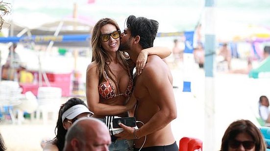 Neste domingo (2), Nicole Bahls e o noivo Marcelo Bimbi aproveitaram o dia ensolarado para curtirem uma praia.