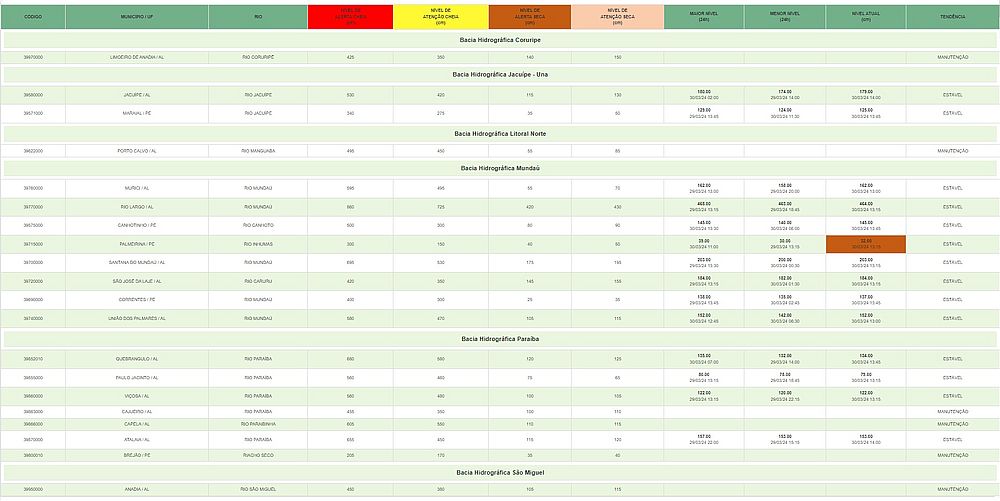 A equipe da Semarh reforçou que está em monitoramento constante das condições de tempo, além de acompanhar o nível dos principais rios do estado, informando ao Corpo de Bombeiros de Alagoas e à Defesa Civil, tanto estadual quanto municipais, sobre as situações que precisam de atenção e fornecendo atualizações adicionais.