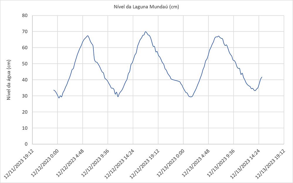 Outro gráfico disponibilizado no Sistema de Informações de Recursos Hídricos de Alagoas (SIRH), feito a partir de dados colhidos no último dia 12, também mostra que não houve alteração do nível da laguna em um intervalo de 24 horas. Os dados, medidos a cada 15 minutos, apresentaram uma variação considerada dentro da normalidade para o atual ciclo de maré.